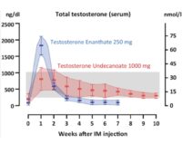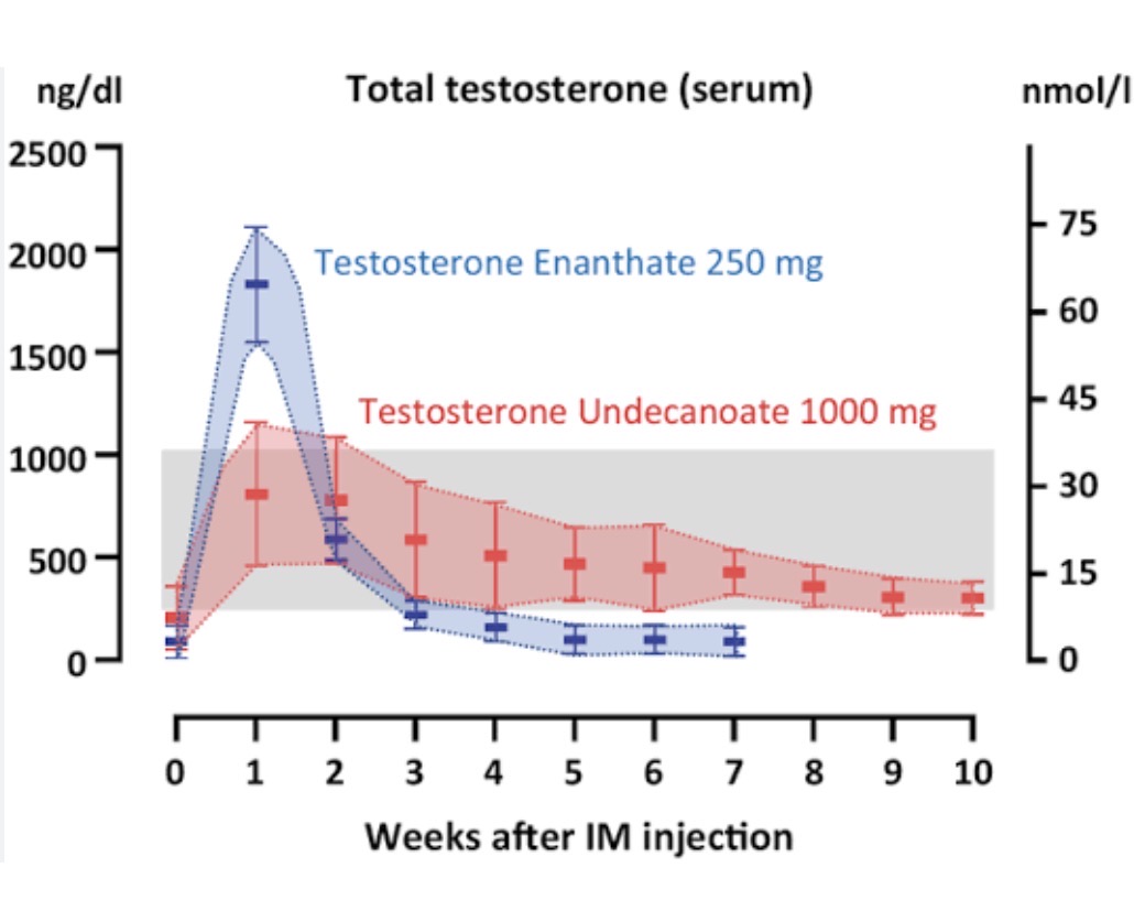 En contraste, en las formulaciones inyectables, la testosterona está unida químicamente al ácido graso (esterificación) de manera que, para ser liberada, la cadena debe ser degradada. Por ejemplo, una preparacion de testosterona con propionato (3 carbones) tiene una duración de una semana con efecto inicial en horas mientras que la preparación de 11 carbonos (undecanoato) toma 1-2 semanas para iniciarlo pero con una duración de hasta 6 meses.